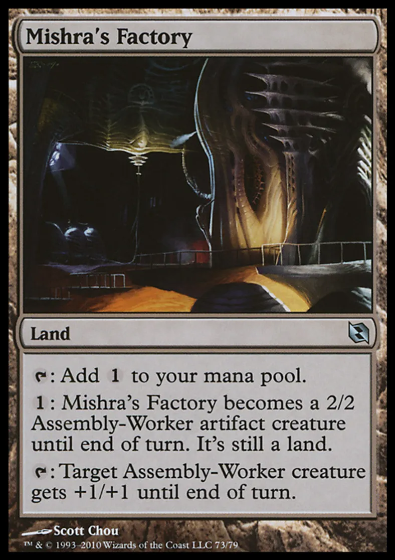 | Oracle Text | {{t}}: Add {{1}} to your mana pool. {{1}}: Mishra's Factory becomes a 2/2 Assembly-Worker artifact creature until end of turn. It's still a land. {{t}}: Target Assembly-Worker creature gets +1/+1 until end of turn. | ||