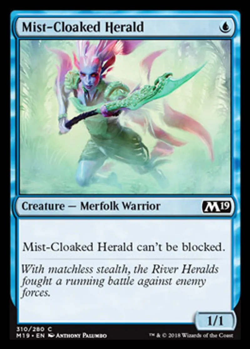 Magic: the Gathering (mtg) Common Creature - Merfolk Warrior Mist-Cloaked Herald from Core Set 2019 (M19) last updated 2026-03-31 15:32:35