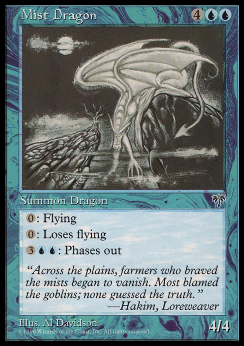 | Oracle Text | {{0}}: Mist Dragon gains flying. (This effect lasts indefinitely.) {{0}}: Mist Dragon loses flying. (This effect lasts indefinitely.) {{3}}{{u}}{{u}}: Mist Dragon phases out. (While it's phased out, it's treated as though it doesn't exist. It phases in before you untap during your next untap step.) | ||