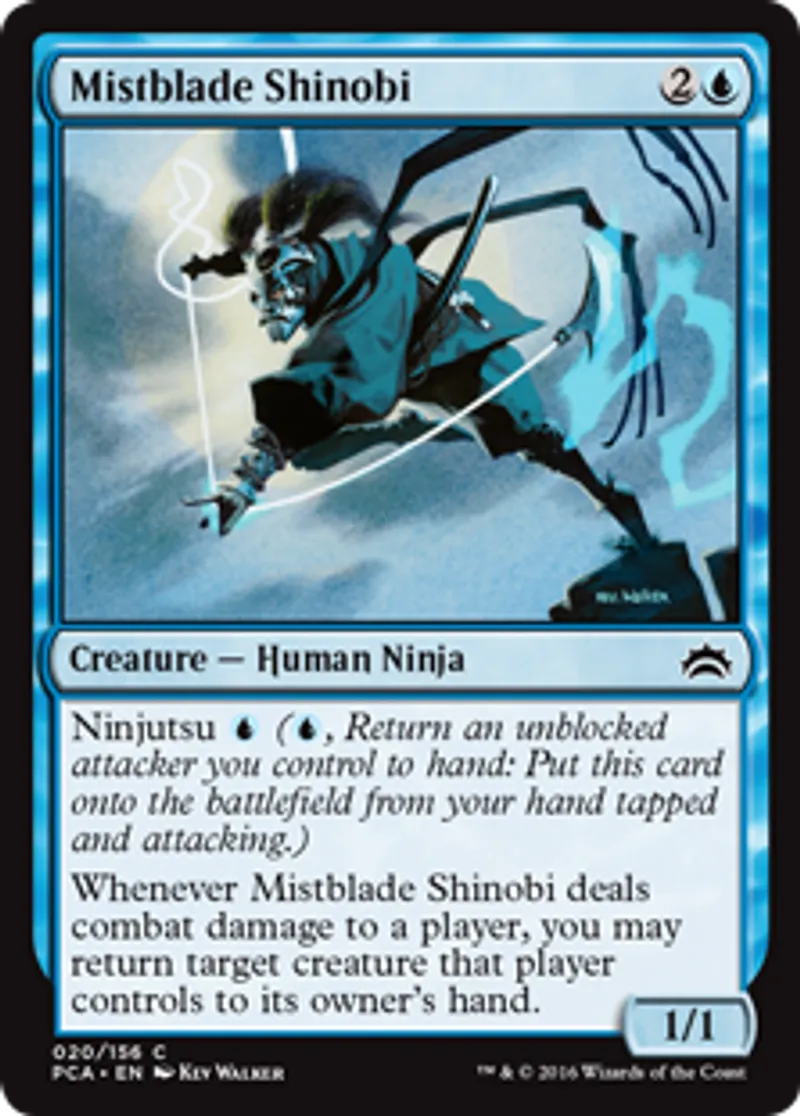 | Oracle Text | Ninjutsu {{u}} ({{u}}, Return an unblocked attacker you control to hand: Put this card onto the battlefield from your hand tapped and attacking.) Whenever Mistblade Shinobi deals combat damage to a player, you may return target creature that player controls to its owner's hand. | ||