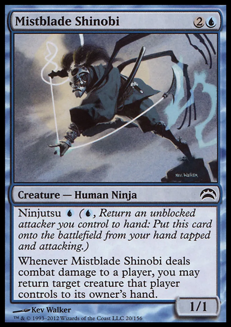 | Oracle Text | Ninjutsu {{u}} ({{u}}, Return an unblocked attacker you control to hand: Put this card onto the battlefield from your hand tapped and attacking.) Whenever Mistblade Shinobi deals combat damage to a player, you may return target creature that player controls to its owner's hand. | ||