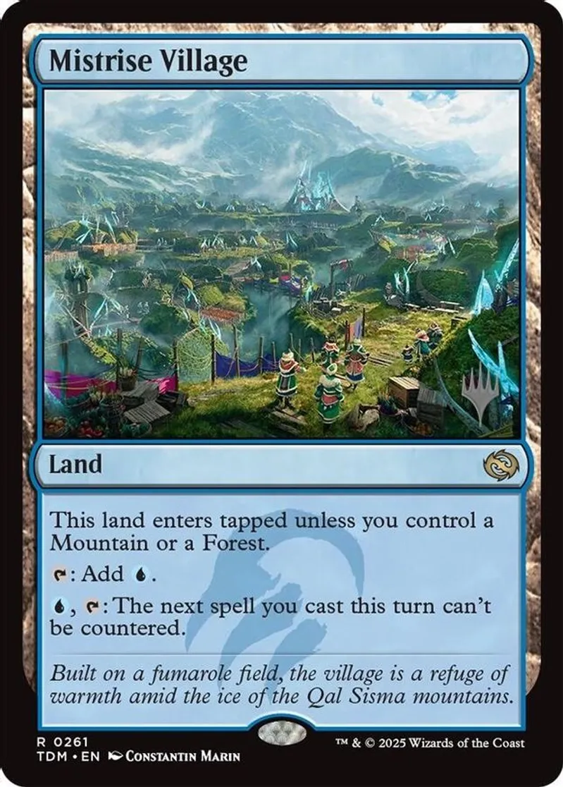 Magic: the Gathering (mtg) Rare land Mistrise Village from Promo Pack: Tarkir: Dragonstorm (PPTDM) last updated 2026-04-02 14:24:03