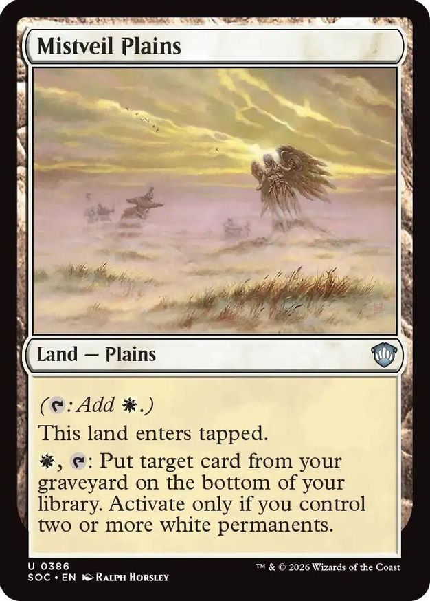Magic: the Gathering (mtg) Uncommon land — plains Mistveil Plains from Commander: Secrets of Strixhaven (SOC) last updated 2026-04-17 00:30:29