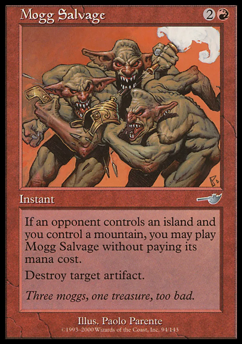 | Oracle Text | If an opponent controls an Island and you control a Mountain, you may cast Mogg Salvage without paying its mana cost. Destroy target artifact. | ||