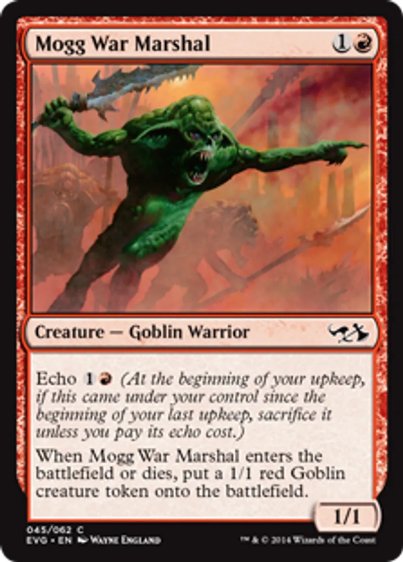 | Oracle Text | Echo {{1}}{{r}} (At the beginning of your upkeep, if this came under your control since the beginning of your last upkeep, sacrifice it unless you pay its echo cost.) When Mogg War Marshal enters the battlefield or dies, create a 1/1 red Goblin creature token. | ||