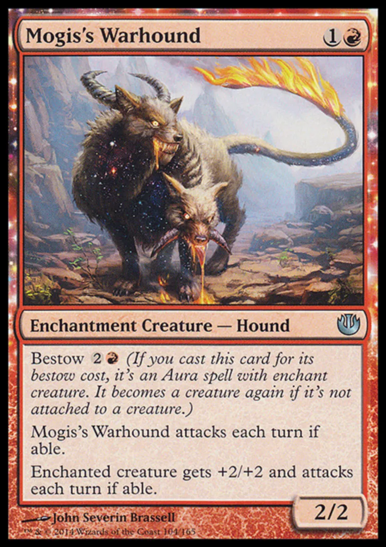 | Oracle Text | Bestow {{2}}{{r}} (If you cast this card for its bestow cost, it's an Aura spell with enchant creature. It becomes a creature again if it's not attached to a creature.) Mogis's Warhound attacks each turn if able. Enchanted creature gets +2/+2 and attacks each turn if able. | ||