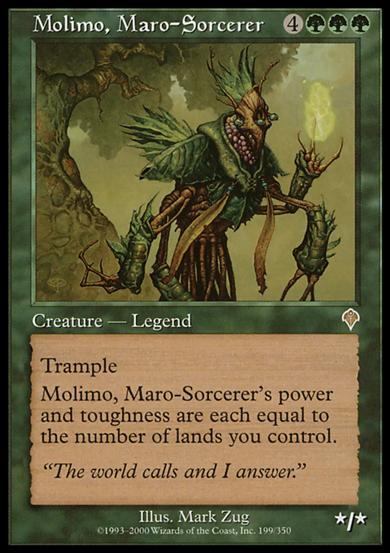 | Oracle Text | Trample (If this creature would assign enough damage to its blockers to destroy them, you may have it assign the rest of its damage to defending player or planeswalker.) Molimo, Maro-Sorcerer's power and toughness are each equal to the number of lands you control. | ||