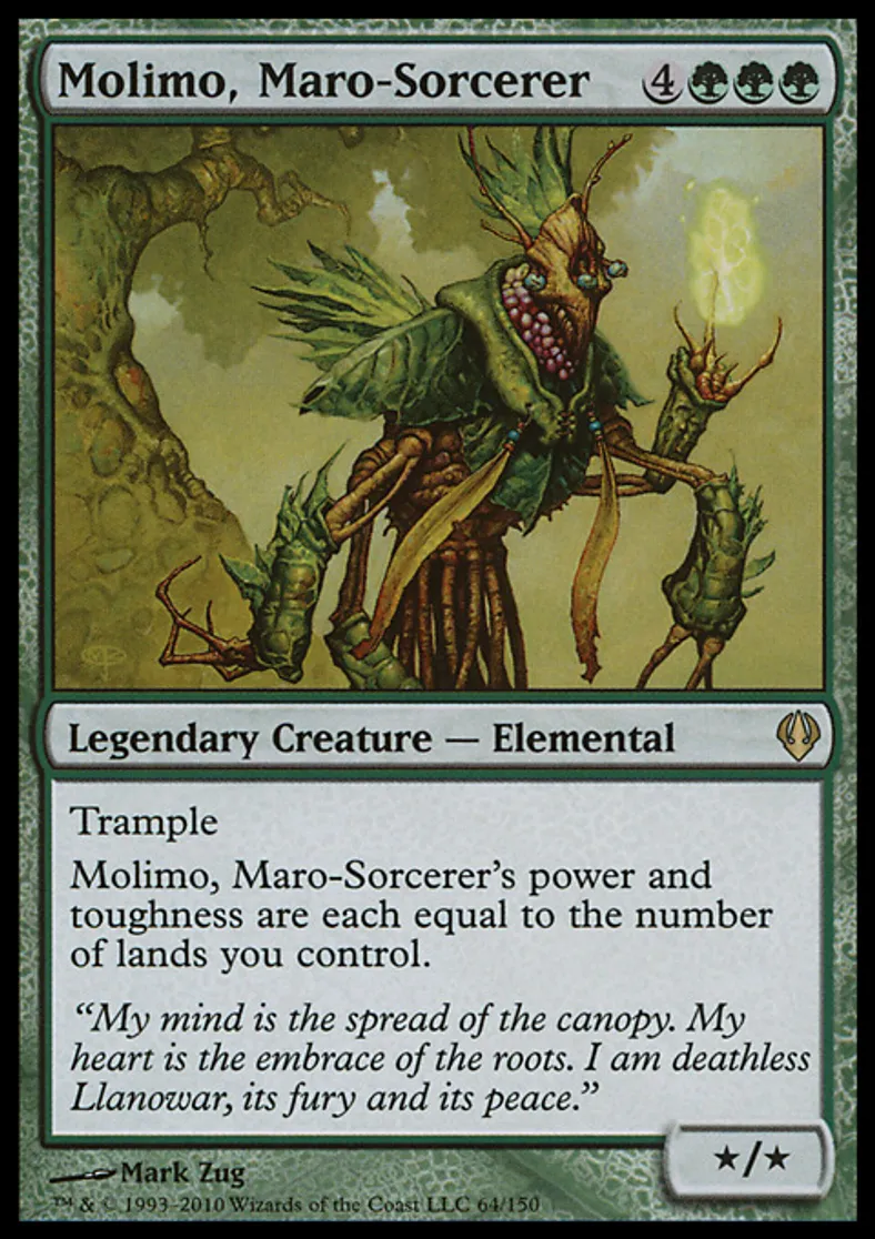| Oracle Text | Trample (If this creature would assign enough damage to its blockers to destroy them, you may have it assign the rest of its damage to defending player or planeswalker.) Molimo, Maro-Sorcerer's power and toughness are each equal to the number of lands you control. | ||