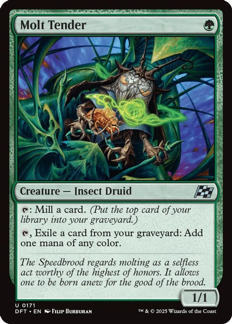 Magic: the Gathering (mtg) Uncommon creature — insect druid Molt Tender from Aetherdrift (DFT) last updated 2025-12-20 15:34:32