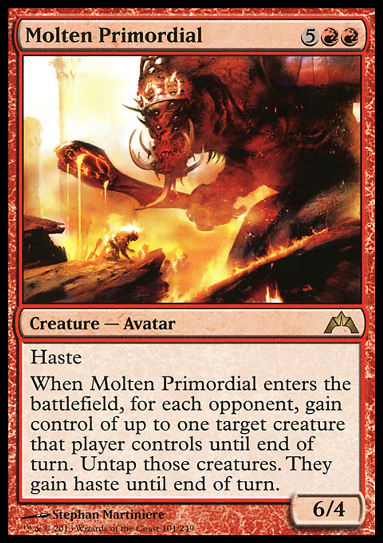 | Oracle Text | Haste When Molten Primordial enters the battlefield, for each opponent, gain control of up to one target creature that player controls until end of turn. Untap those creatures. They gain haste until end of turn. | ||