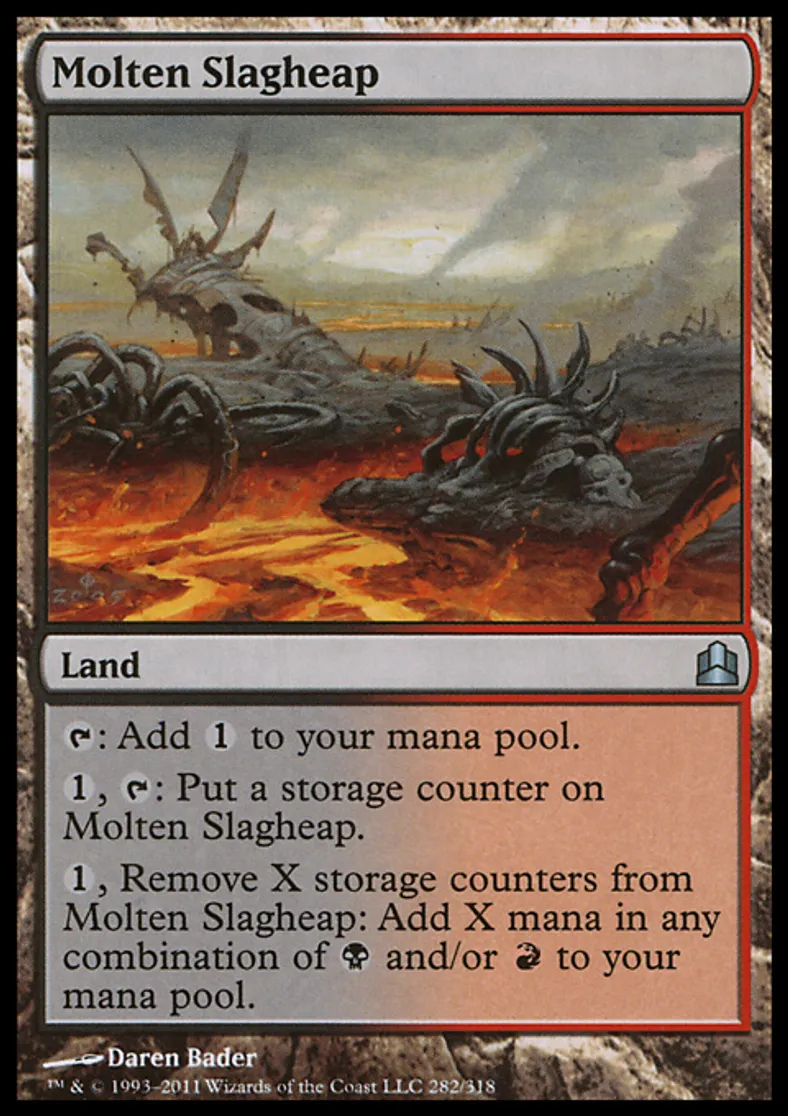 | Oracle Text | {{t}}: Add {{1}} to your mana pool. {{1}}, {{t}}: Put a storage counter on Molten Slagheap. {{1}}, Remove X storage counters from Molten Slagheap: Add X mana in any combination of {{b}} and/or {{r}} to your mana pool. | ||