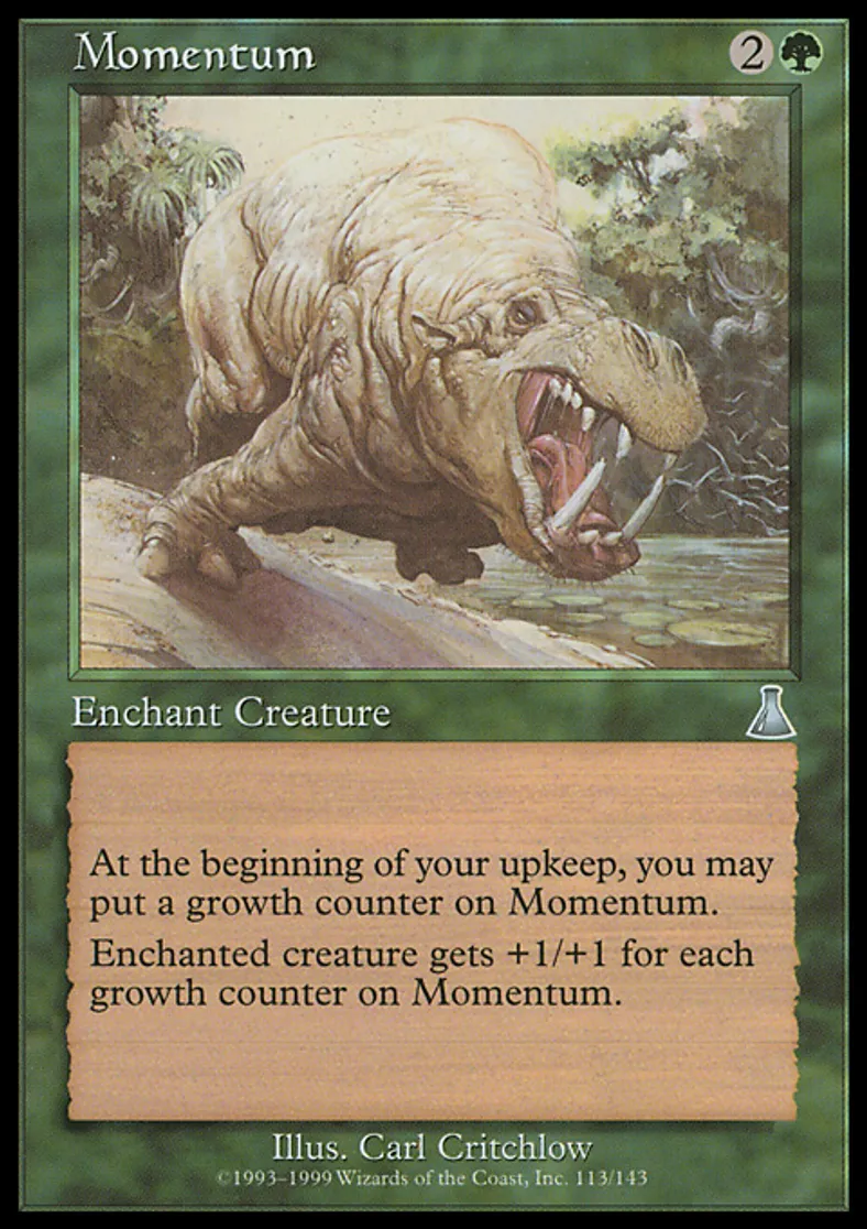 | Oracle Text | Enchant creature At the beginning of your upkeep, you may put a growth counter on Momentum. Enchanted creature gets +1/+1 for each growth counter on Momentum. | ||