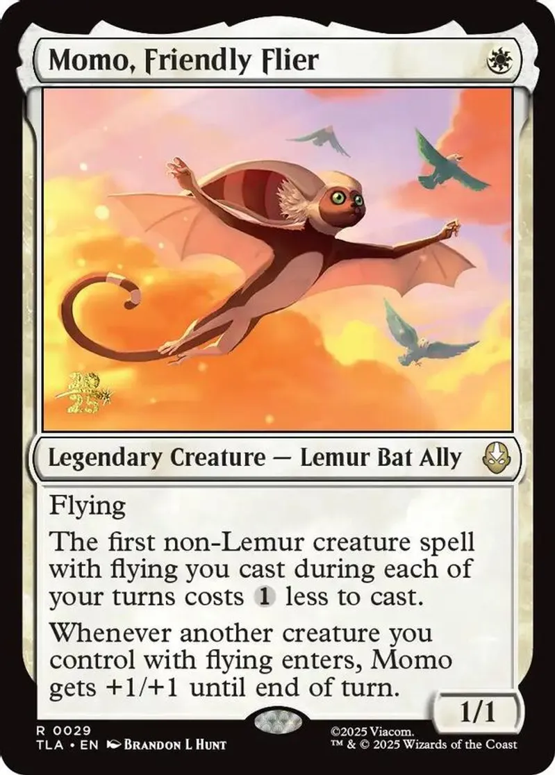 the first non-lemur creature spell with flying you cast during each of your turns costs 1 less to cast. whenever another creature you control with flying enters, momo gets +1/+1 until end of turn. | ||