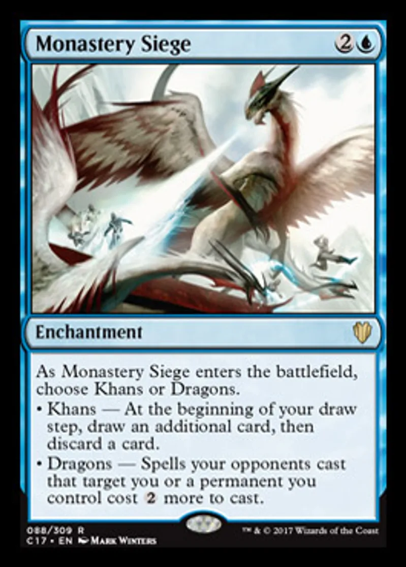 | Oracle Text | As Monastery Siege enters the battlefield, choose Khans or Dragons. • Khans — At the beginning of your draw step, draw an additional card, then discard a card. • Dragons — Spells your opponents cast that target you or a permanent you control cost {{2}} more to cast. | ||