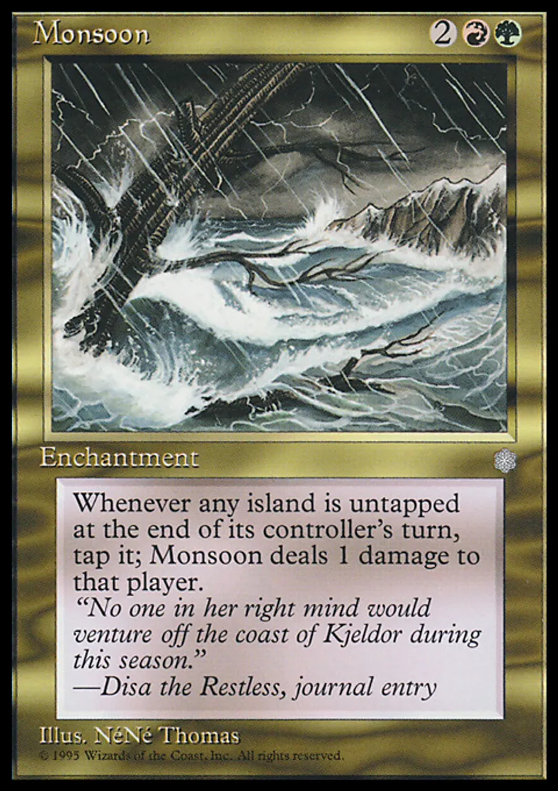 | Oracle Text | At the beginning of each player's end step, tap all untapped Islands that player controls and Monsoon deals X damage to the player, where X is the number of Islands tapped this way. | ||