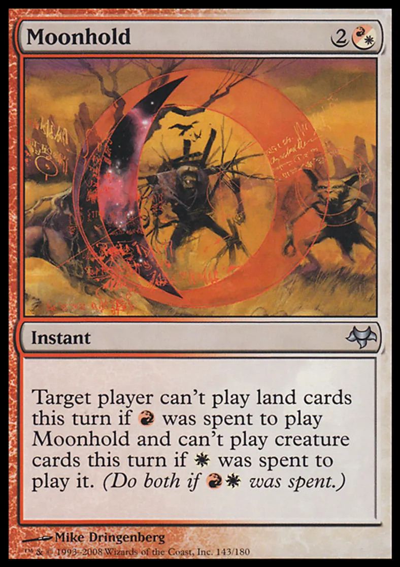 | Oracle Text | Target player can't play land cards this turn if {{r}} was spent to cast Moonhold and can't play creature cards this turn if {{w}} was spent to cast it. (Do both if {{r}}{{w}} was spent.) | ||