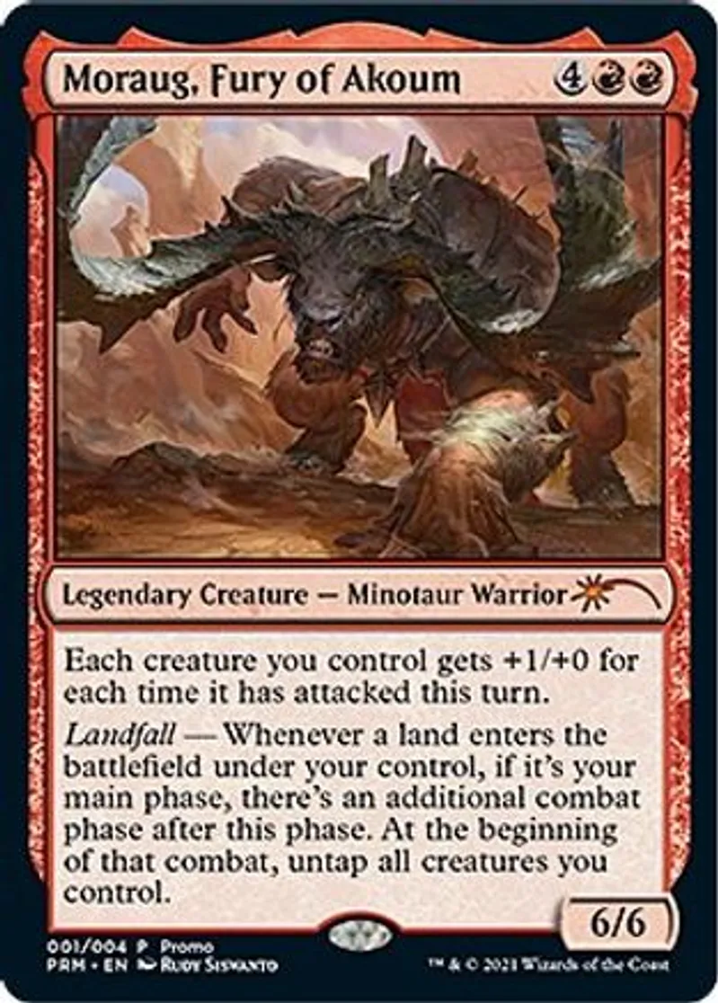 Magic: the Gathering (mtg) Special Legendary Creature — Minotaur Warrior Moraug, Fury of Akoum from Unique and Miscellaneous Promos (pUNI) last updated 2026-02-25 14:27:02