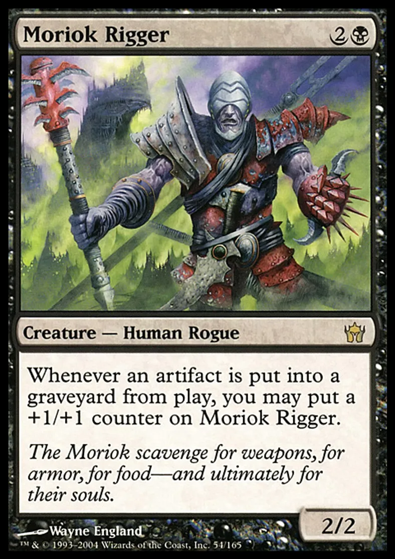 | Oracle Text | Whenever an artifact is put into a graveyard from the battlefield, you may put a +1/+1 counter on Moriok Rigger. | ||