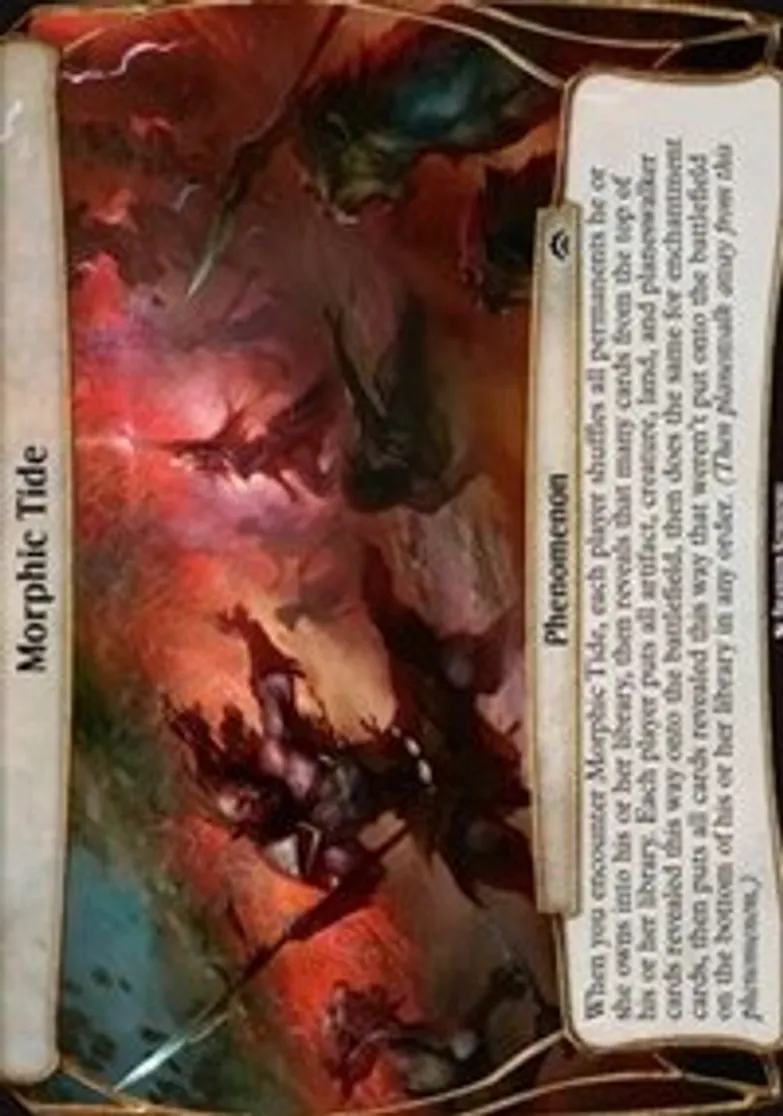 | Oracle Text | When you encounter Morphic Tide, each player shuffles all permanents he or she owns into his or her library, then reveals that many cards from the top of his or her library. Each player puts all artifact, creature, land, and planeswalker cards revealed this way onto the battlefield, then does the same for enchantment cards, then puts all cards revealed this way that weren't put onto the battlefield on the bottom of his or her library in any order. (Then planeswalk away from this phenomenon.) | ||