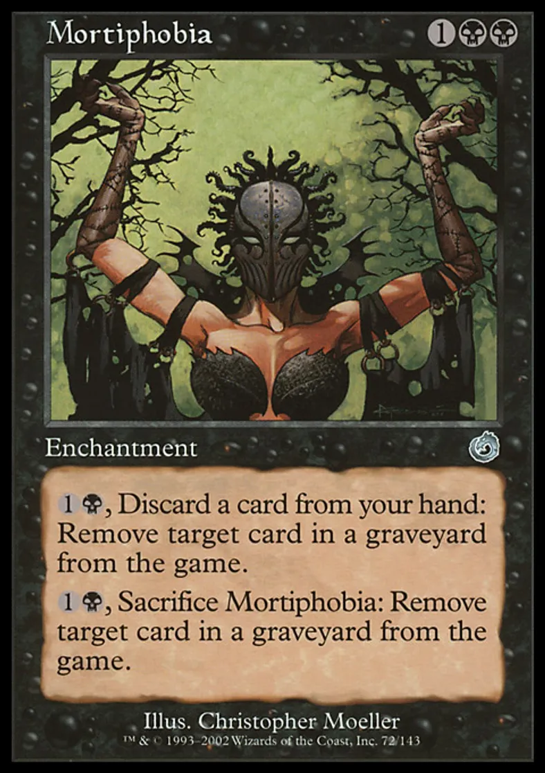 | Oracle Text | {{1}}{{b}}, Discard a card: Exile target card from a graveyard. {{1}}{{b}}, Sacrifice Mortiphobia: Exile target card from a graveyard. | ||