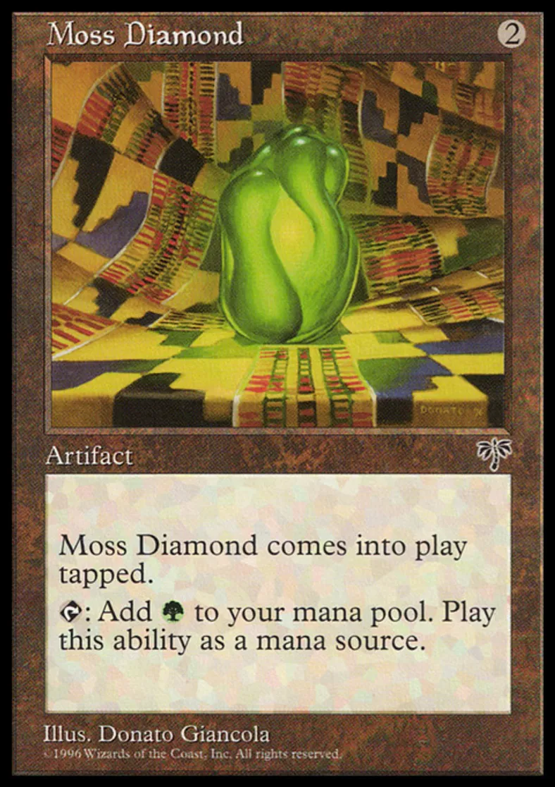 | Oracle Text | Moss Diamond enters the battlefield tapped. {{t}}: Add {{g}} to your mana pool. | ||