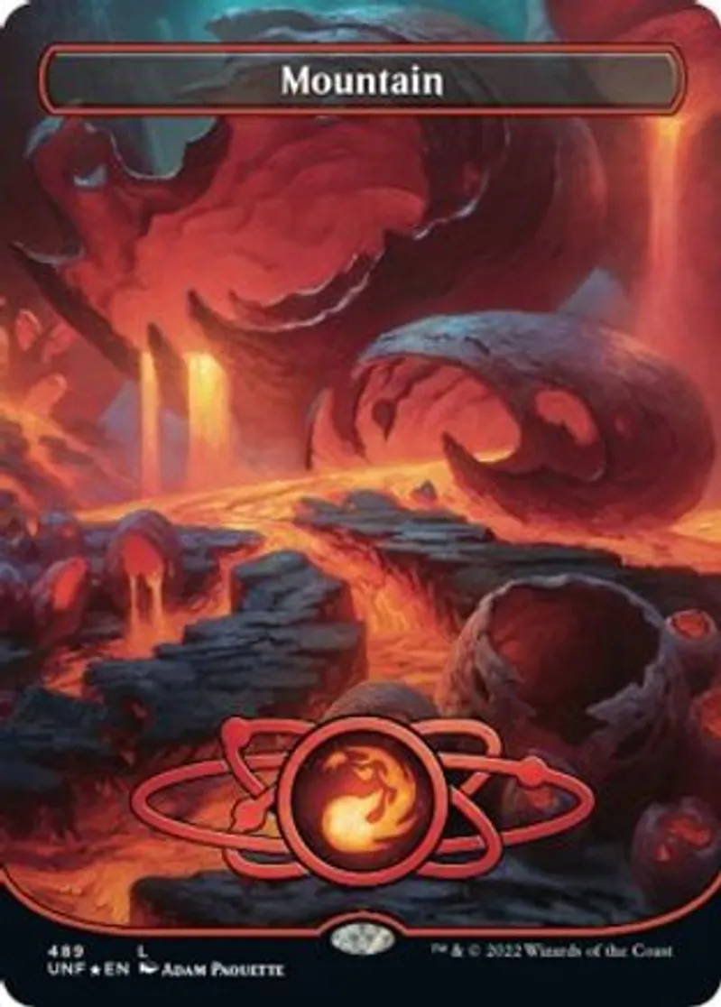 Mountain (489) (Borderless) (Galaxy Foil) is a Basic Land in the set Unfinity.