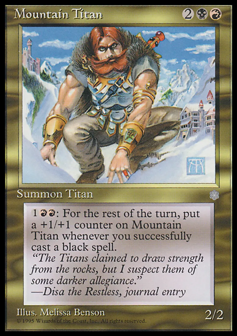 | Oracle Text | {{1}}{{r}}{{r}}: Until end of turn, whenever you cast a black spell, put a +1/+1 counter on Mountain Titan. | ||
