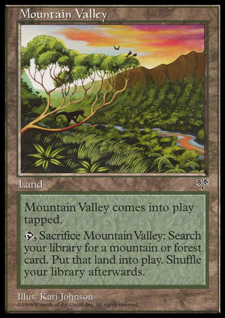 | Oracle Text | Mountain Valley enters the battlefield tapped. {{t}}, Sacrifice Mountain Valley: Search your library for a Mountain or Forest card and put it onto the battlefield. Then shuffle your library. | ||
