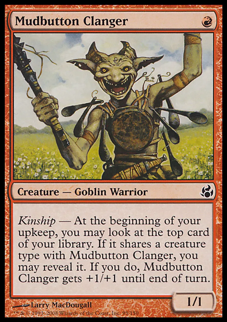 | Oracle Text | Kinship — At the beginning of your upkeep, you may look at the top card of your library. If it shares a creature type with Mudbutton Clanger, you may reveal it. If you do, Mudbutton Clanger gets +1/+1 until end of turn. | ||