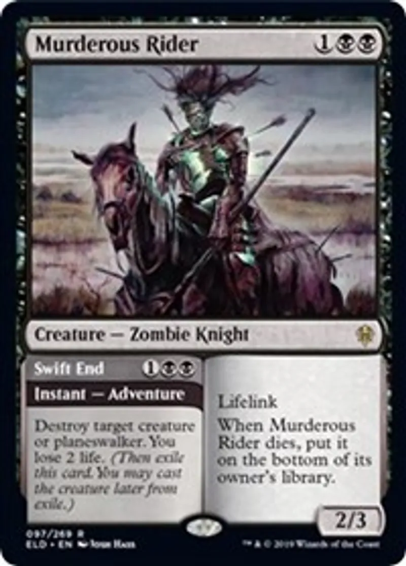 | Oracle Text | Lifelink\r\nWhen Murderous Rider dies, put it on the bottom of its owner\'s library.\r\n\r\nSwift End 1BB\r\nInstant — Adventure\r\nDestroy target creature or planeswalker. You lose 2 life. (Then exile this card. You may cast the creature later from exile.) | ||