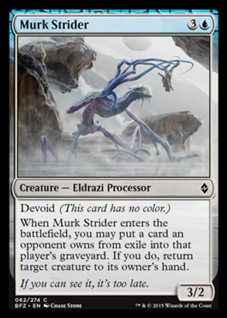 | Oracle Text | Devoid (This card has no color.) When Murk Strider enters the battlefield, you may put a card an opponent owns from exile into that player's graveyard. If you do, return target creature to its owner's hand. | ||