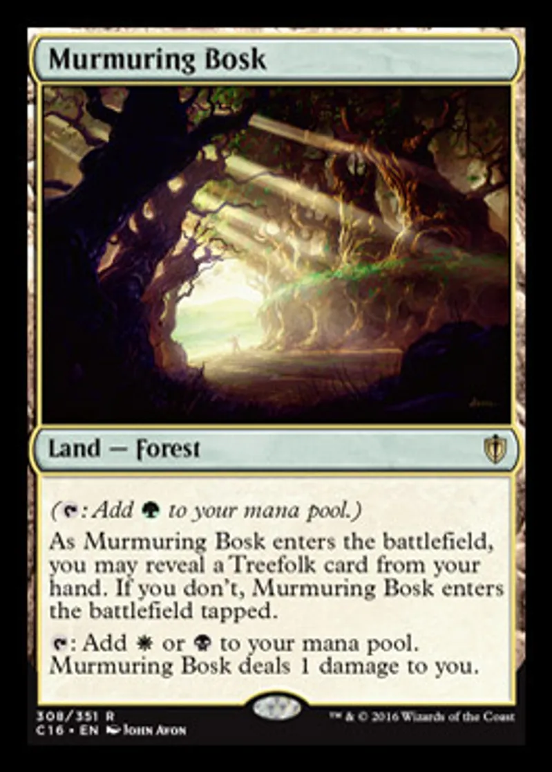 | Oracle Text | ({{t}}: Add {{g}} to your mana pool.) As Murmuring Bosk enters the battlefield, you may reveal a Treefolk card from your hand. If you don't, Murmuring Bosk enters the battlefield tapped. {{t}}: Add {{w}} or {{b}} to your mana pool. Murmuring Bosk deals 1 damage to you. | ||