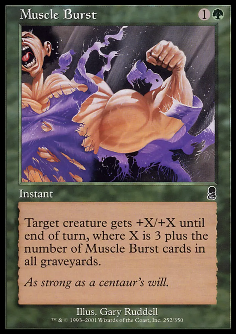 | Oracle Text | Target creature gets +X/+X until end of turn, where X is 3 plus the number of cards named Muscle Burst in all graveyards. | ||