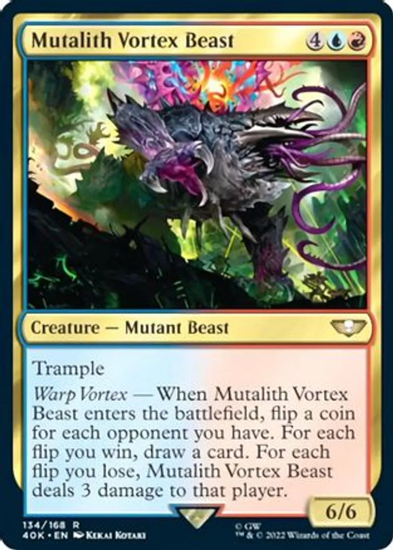 Warp Vortex — When Mutalith Vortex Beast enters the battlefield, flip a coin for each opponent you have. For each flip you win, draw a card. For each flip you lose, Mutalith Vortex Beast deals 3 damage to that player. | ||