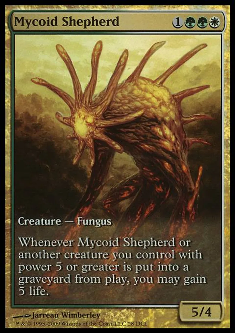 | Oracle Text | Whenever Mycoid Shepherd or another creature you control with power 5 or greater dies, you may gain 5 life. | ||