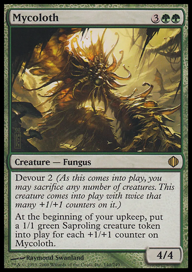 | Oracle Text | Devour 2 (As this enters the battlefield, you may sacrifice any number of creatures. This creature enters the battlefield with twice that many +1/+1 counters on it.) At the beginning of your upkeep, put a 1/1 green Saproling creature token onto the battlefield for each +1/+1 counter on Mycoloth. | ||