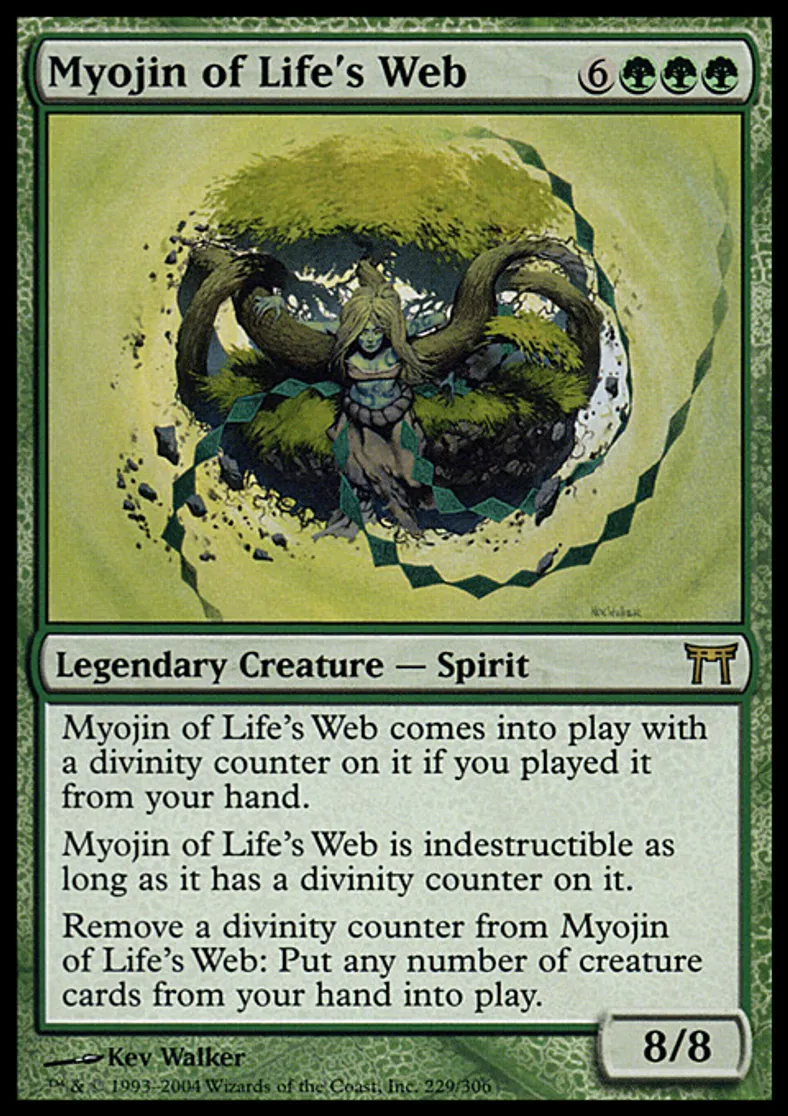 | Oracle Text | Myojin of Life's Web enters the battlefield with a divinity counter on it if you cast it from your hand. Myojin of Life's Web is indestructible as long as it has a divinity counter on it. Remove a divinity counter from Myojin of Life's Web: Put any number of creature cards from your hand onto the battlefield. | ||