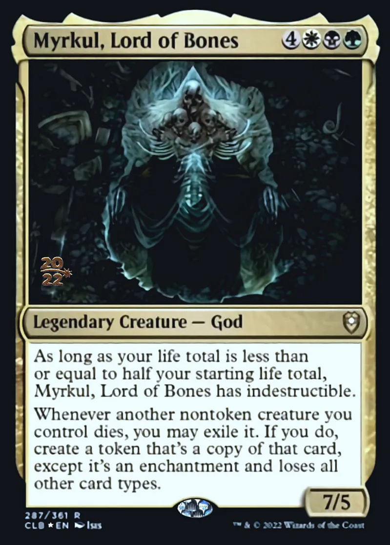 | Oracle Text | As long as your life total is less than or equal to half your starting life total, Myrkul, Lord of Bones has indestructible.
