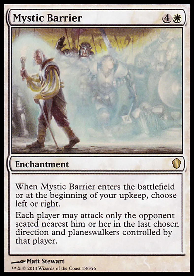 | Oracle Text | When Mystic Barrier enters the battlefield or at the beginning of your upkeep, choose left or right. Each player may attack only the opponent seated nearest him or her in the last chosen direction and planeswalkers controlled by that player. | ||