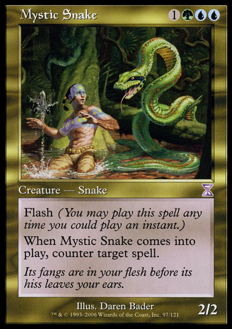 | Oracle Text | Flash (You may cast this spell any time you could cast an instant.) When Mystic Snake enters the battlefield, counter target spell. | ||