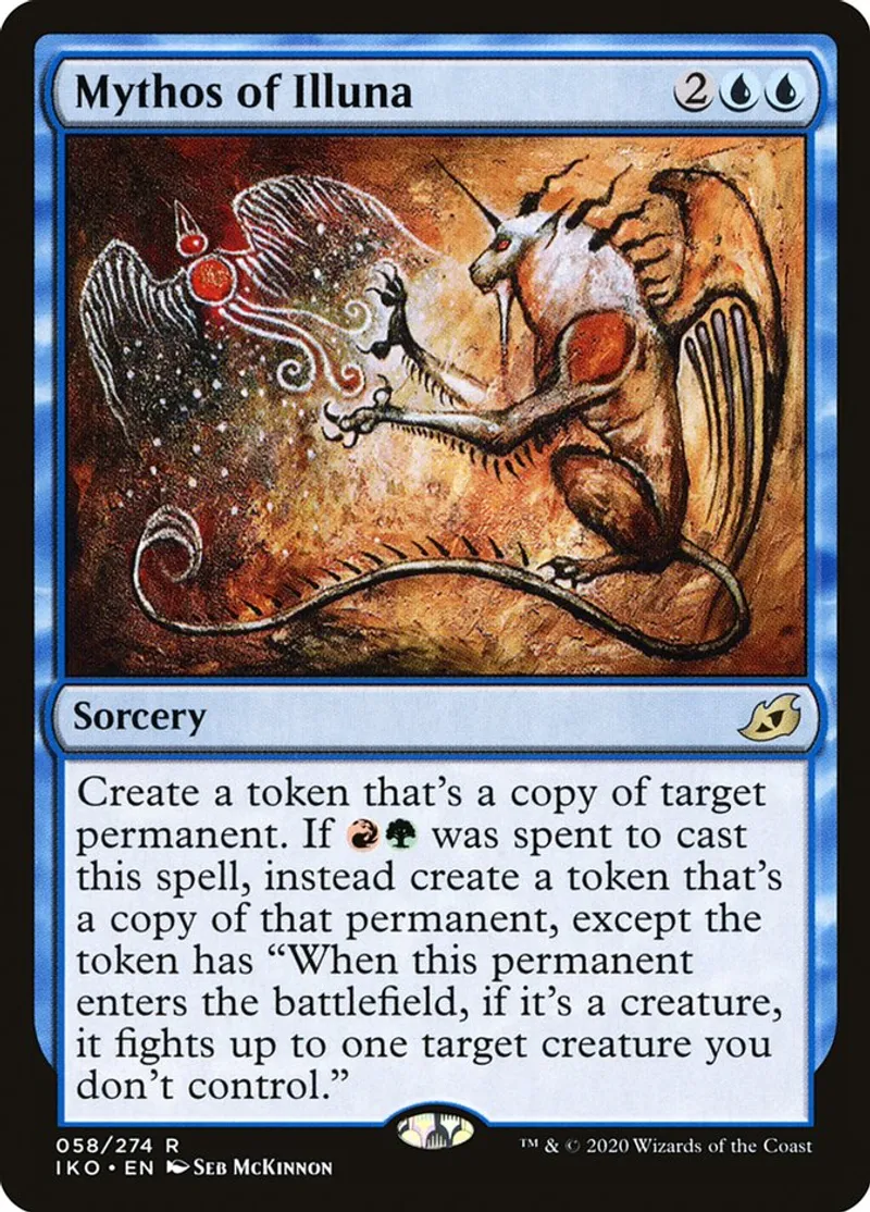 | Oracle Text | Create a token that’s a copy of target permanent. If {{r}}{{g}} was spent to cast this spell, instead create a token that’s a copy of that permanent, except the token has “When this permanent enters the battlefield, if it’s a creature, it fights up to one target creature you don’t control.” | ||