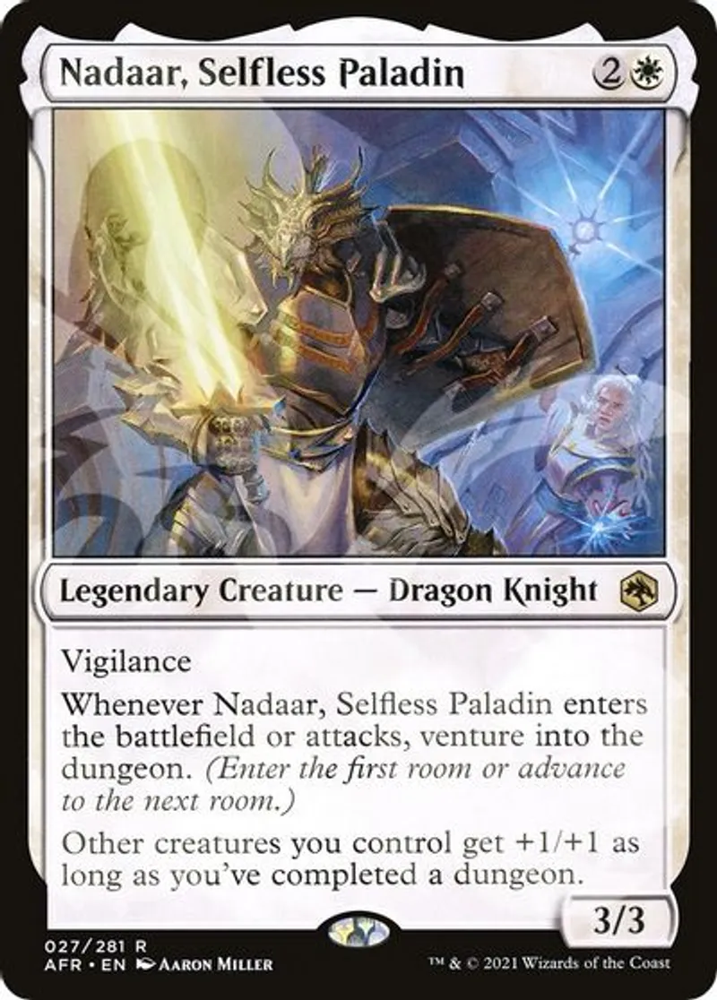 Whenever Nadaar, Selfless Paladin enters the battlefield or attacks, venture into the dungeon. (Enter the first room or advance to the next room.)