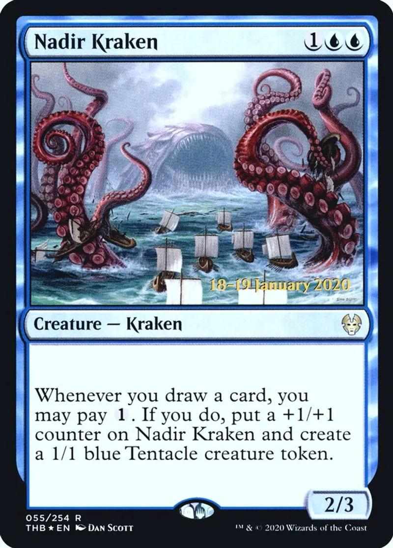 | Oracle Text | Whenever you draw a card, you may pay {{1}}. If you do, put a +1/+1 counter on Nadir Kraken and create a 1/1 blue Tentacle creature token. | ||