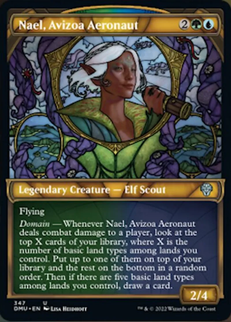 Domain — Whenever Nael, Avizoa Aeronaut deals combat damage to a player, look at the top X cards of your library, where X is the number of basic land types among lands you control. Put up to one of them on top of your library and the rest on the bottom in a random order. Then if there are five basic land types among lands you control, draw a card. | ||