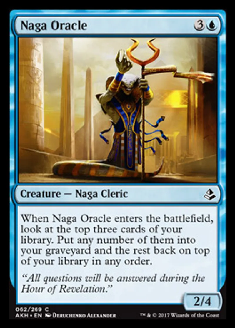 | Oracle Text | When Naga Oracle enters the battlefield, look at the top three cards of your library. Put any number of them into your graveyard and the rest back on top of your library in any order. | ||