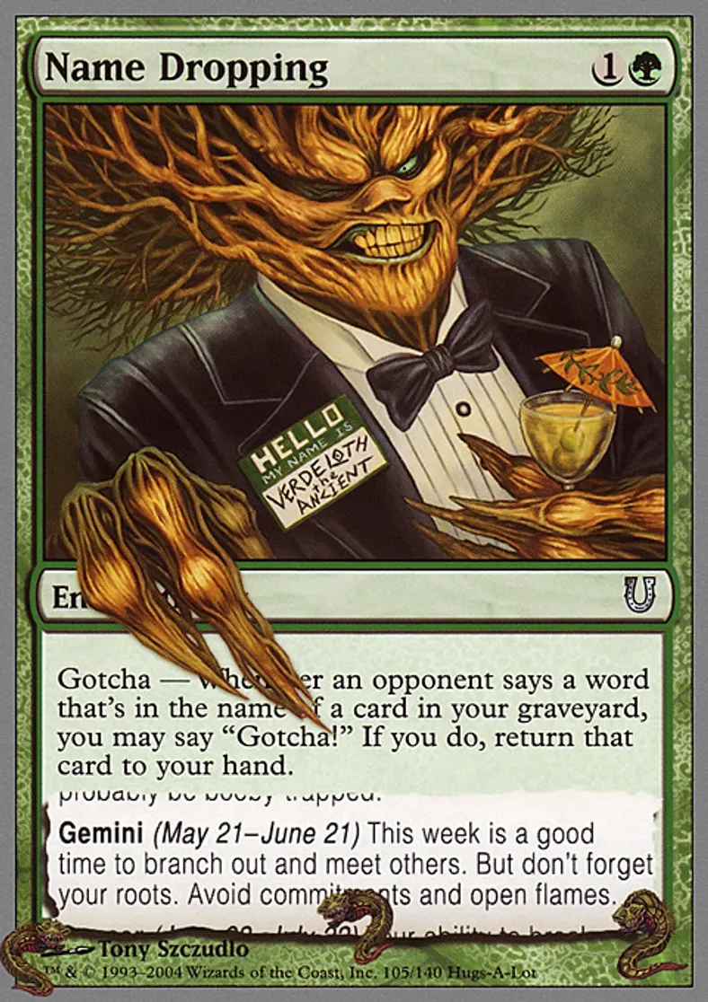 | Oracle Text | Gotcha Whenever an opponent says a word that's in the name of a card in your graveyard, you may say "Gotcha" If you do, return that card to your hand. | ||