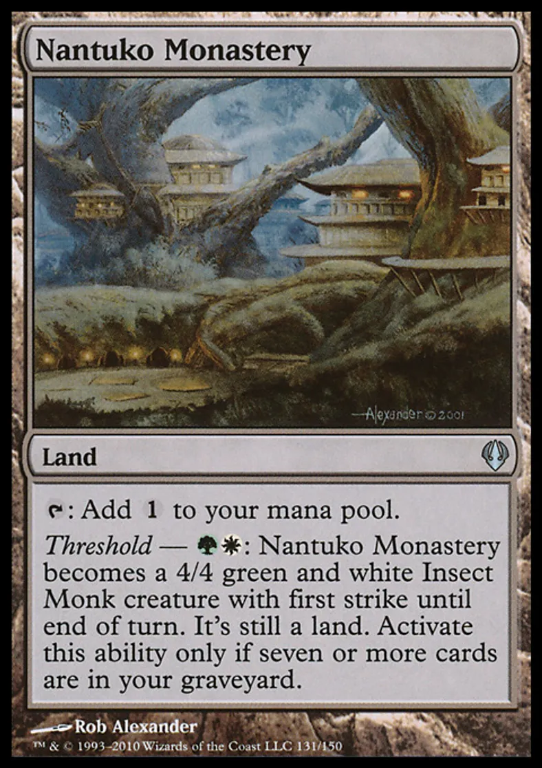 | Oracle Text | {{t}}: Add {{1}} to your mana pool. Threshold — {{g}}{{w}}: Nantuko Monastery becomes a 4/4 green and white Insect Monk creature with first strike until end of turn. It's still a land. Activate this ability only if seven or more cards are in your graveyard. | ||