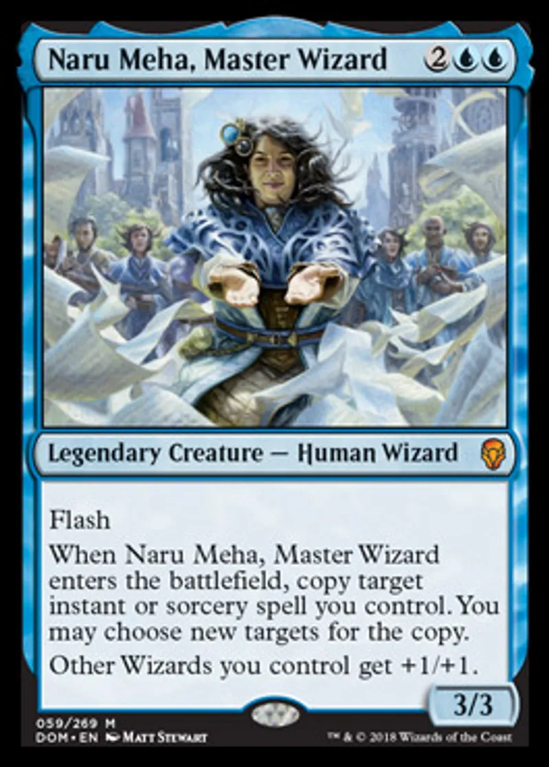 | Oracle Text | Flash When Naru Meha, Master Wizard enters the battlefield, copy target instant or sorcery spell you control. You may choose new targets for the copy. Other Wizards you control get +1/+1. | ||