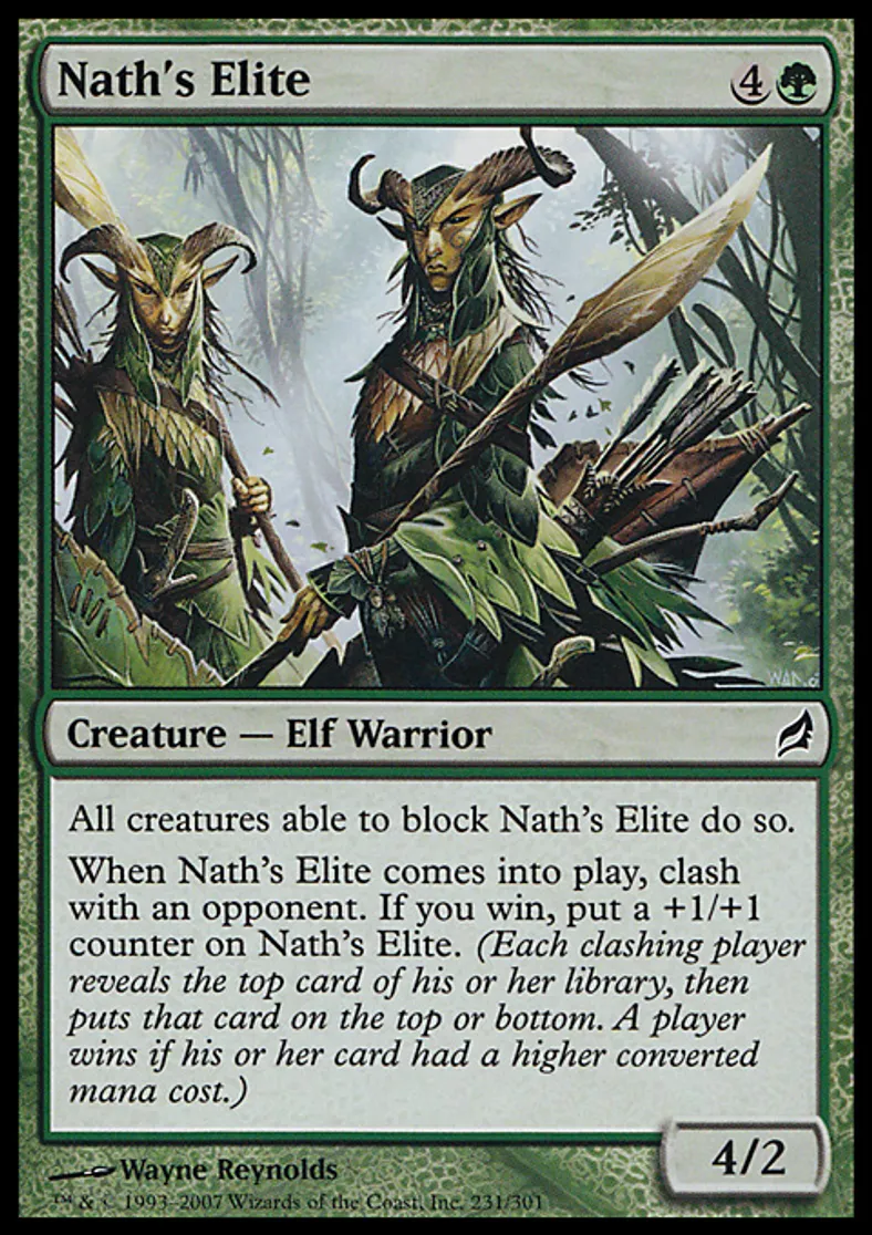 | Oracle Text | All creatures able to block Nath's Elite do so. When Nath's Elite enters the battlefield, clash with an opponent. If you win, put a +1/+1 counter on Nath's Elite. (Each clashing player reveals the top card of his or her library, then puts that card on the top or bottom. A player wins if his or her card had a higher converted mana cost.) | ||