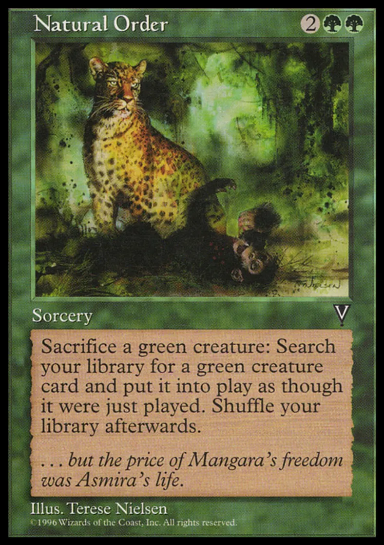 | Oracle Text | As an additional cost to cast Natural Order, sacrifice a green creature. Search your library for a green creature card and put it onto the battlefield. Then shuffle your library. | ||